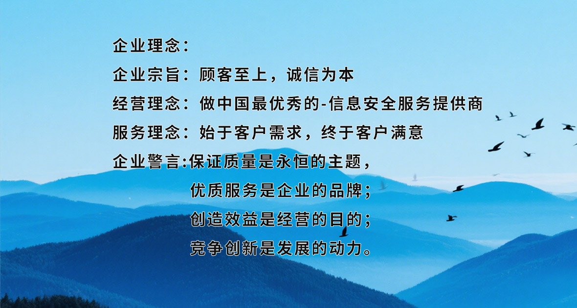 企業理念 企業宗旨:顧客至上,誠信為本。 經營理念:做中國最優秀的-----信息安全服務提供商。 服務理念:始于客戶需求,終于客戶滿意。 企業警言:保證質量是永恒的主題;優質服務是企業的品牌;創造效益是經營的目的;競爭創新是發展的動力。